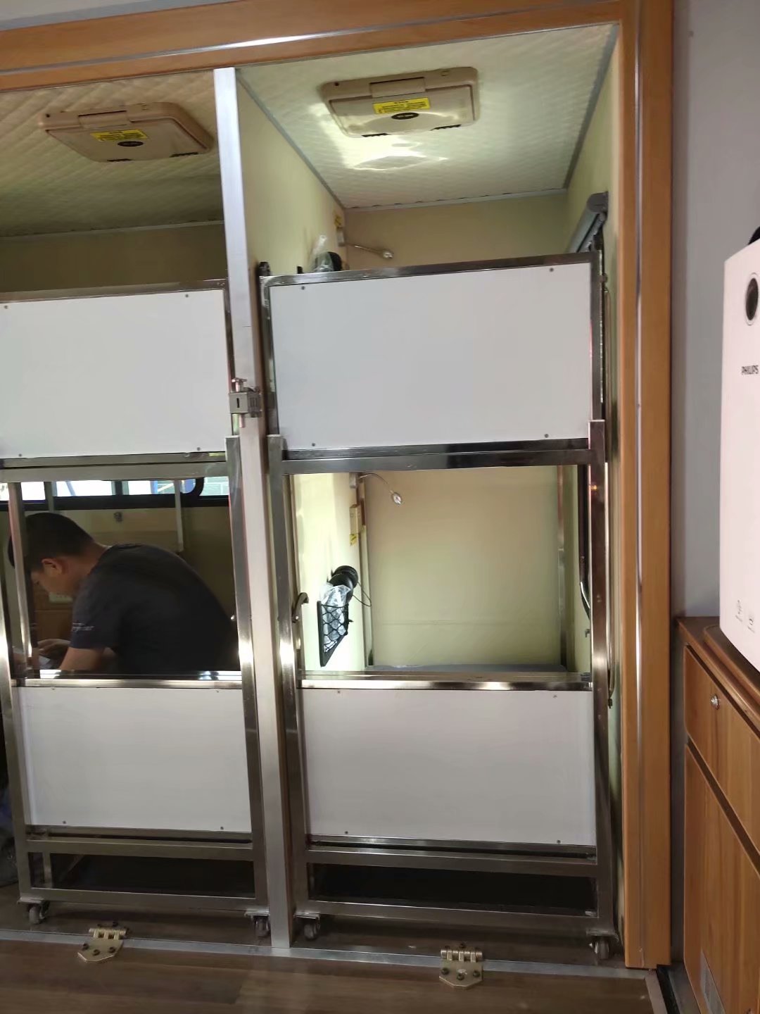 主厢体顶部设有空调,沿顶部送风管道向厢体各处送风。各风口安装双眼布风器,可调节风量及角度;